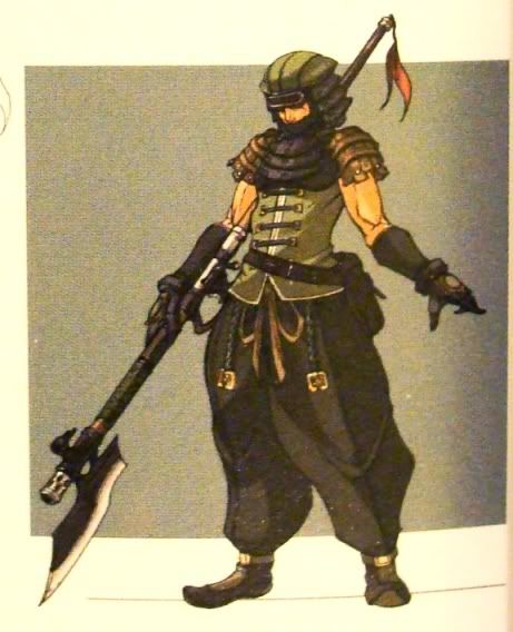 I can actually imagine Kaito using a lot of status effect magic, and stuff like Time (maybe?). And if not a GIGANTIC HUGE shuriken, how about a neat little boomerang? Of sorts. He could fling it at something armoured and listen to it go 'DING'. And yeah, in canon, they're not really heavy on guns… though the little boys carry guns around and they've got some scary lookin' polearm things. http://i45.photobucket.com/albums/f54/Gaumaru/WutaiBoy.jpg http://i45.photobucket.com/albums/f54/Gaumaru/WutaiSoldier.jpg
